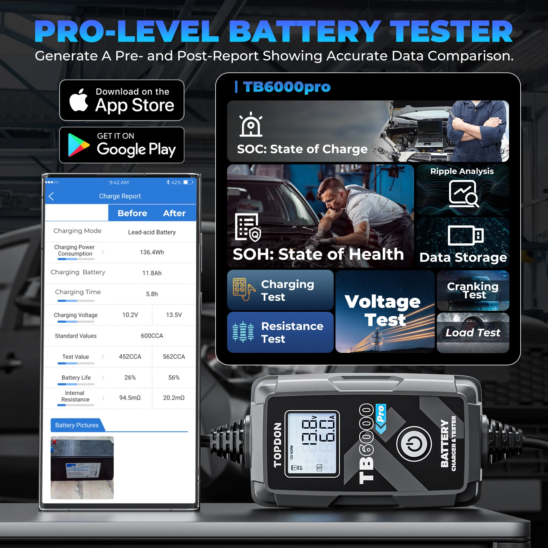 - Two functions, one tool. The TB6000Pro can charge 6V/12V lead-acid and 12V lithium batteries. What’s more, this battery tester can test a battery’s state of charge, state of health, CCA, and more using the Kelvin method. Supporting detailed charging tests and cranking tests for 12V Lead-Acid batteries, the TB6000Pro gives superior battery diagnostics via the mobile app.